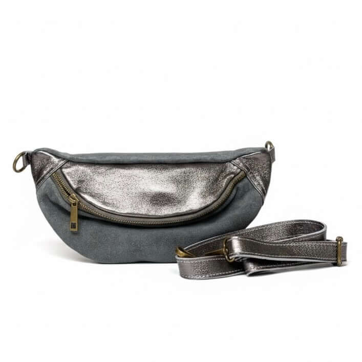 Borseta pentru femei din piele naturala intoarsa, gri laminat- Made in Italy